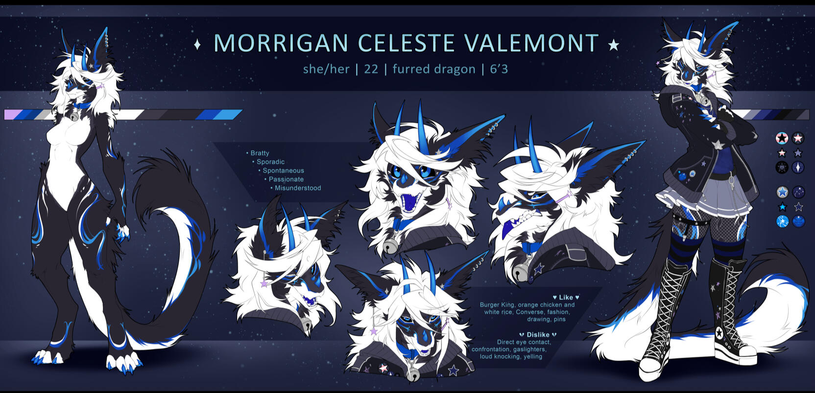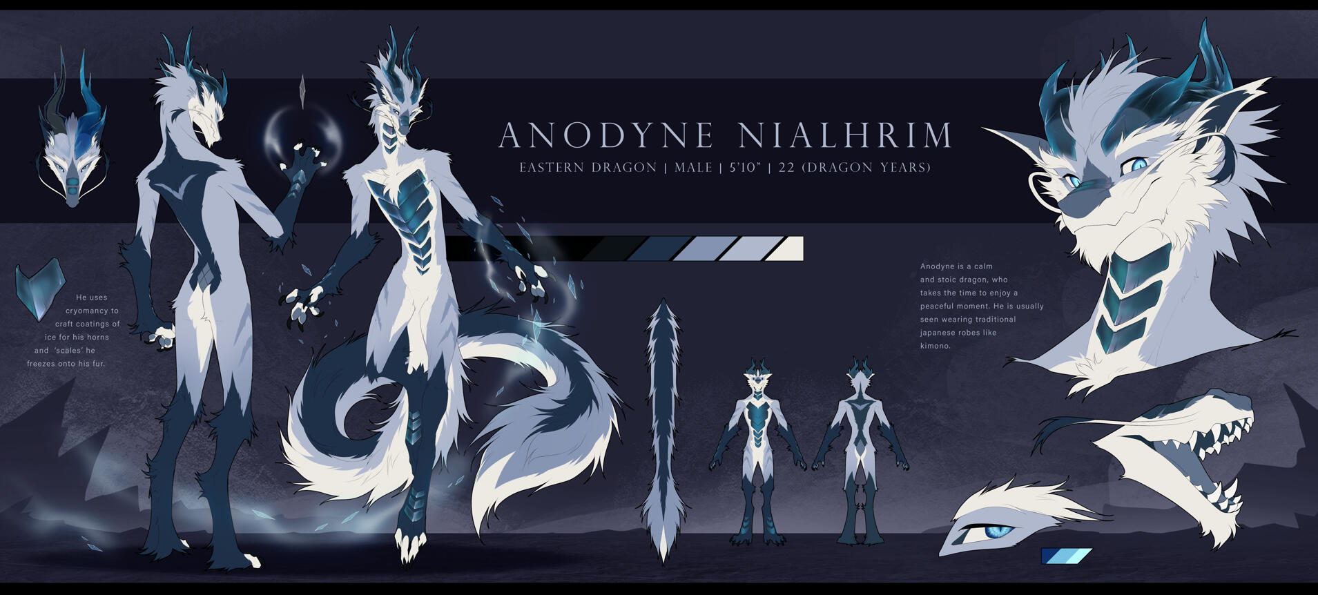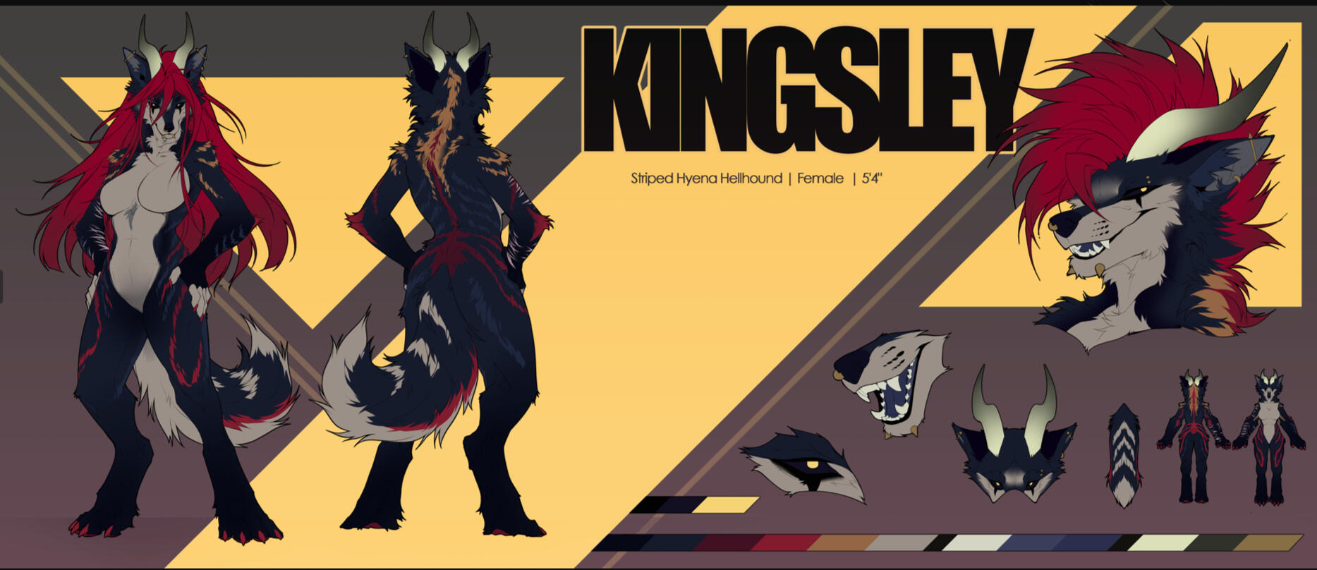 Reference sheets are modular, and can be adapted to your needs. You can chose as many elements as you want on it. The style used for ref sheets is lined flat color.